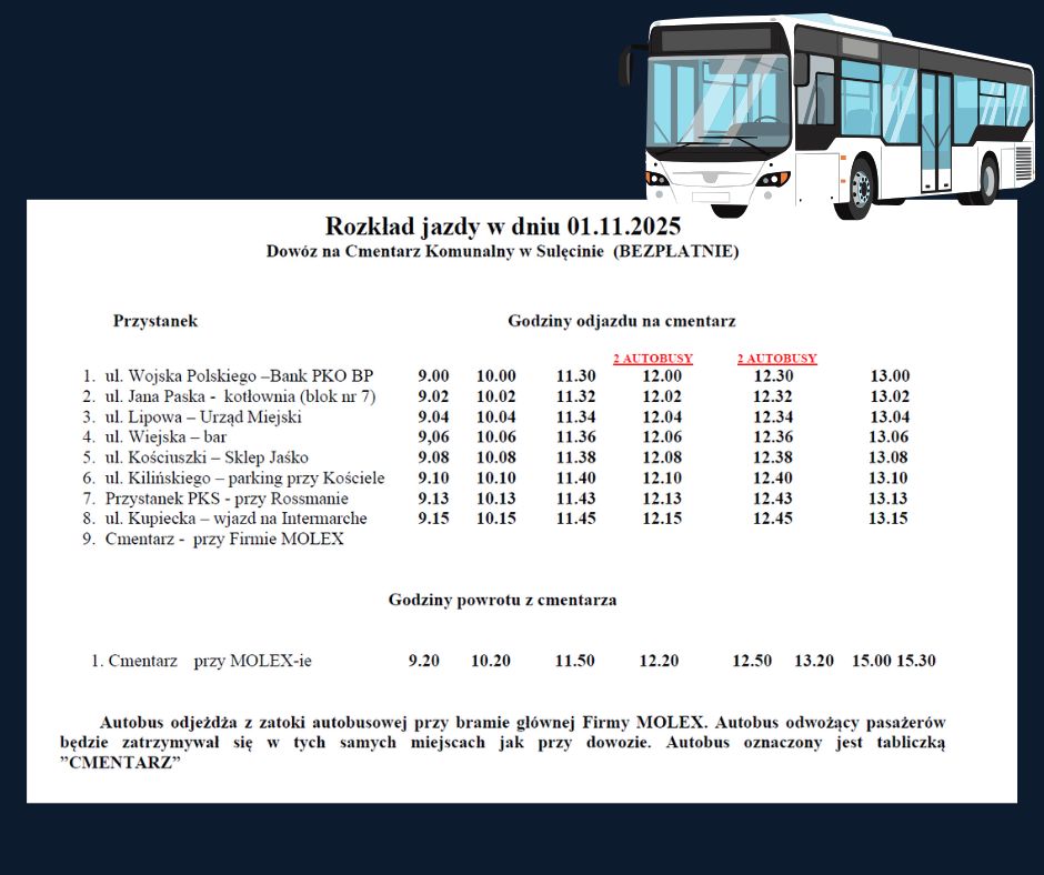 Rozkład jazdy bezpłatnego autobusu na Cmentarz Komunalny w dniu 1 listopada.