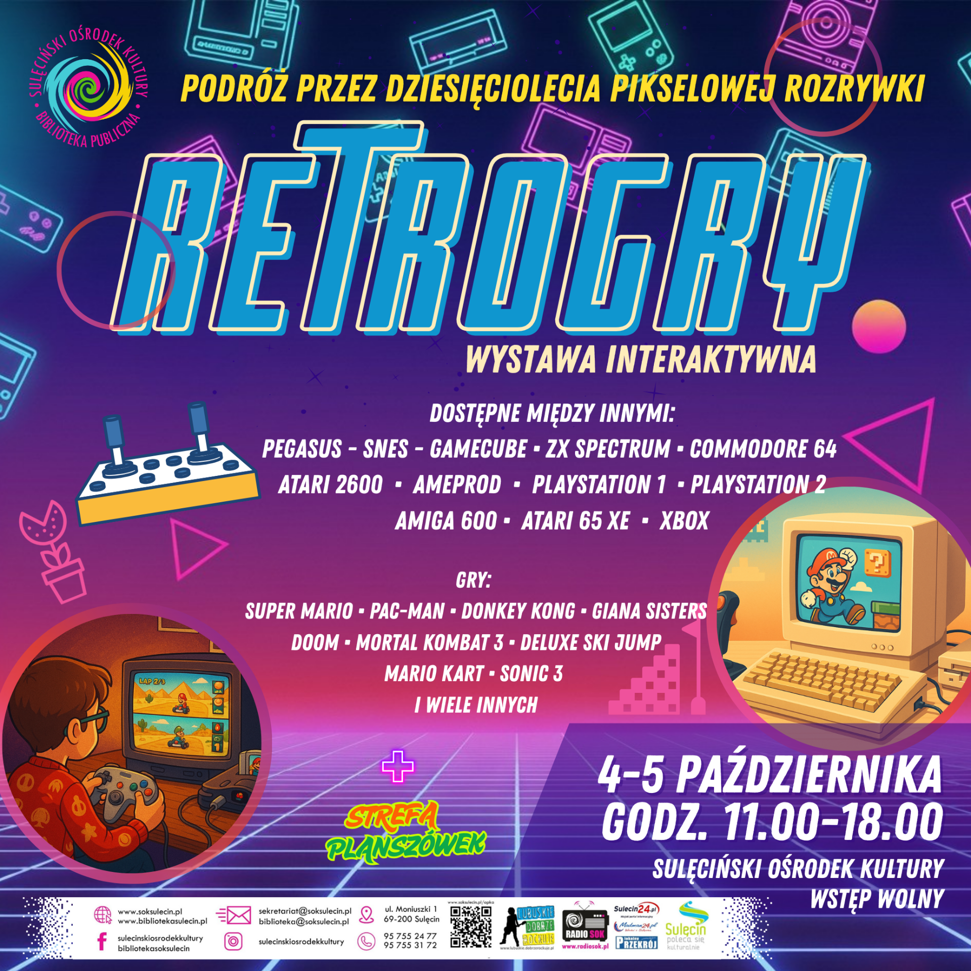 Sulęciński Ośrodek Kultury po raz kolejny zaprasza do świata dawnych komputerów, konsol i kultowych gier wideo. Tegoroczna edycja wydarzenia RetroGRY odbędzie się w dniach 4–5 października 2025 r. w godzinach 11.00–18.00 i zostanie poszerzona o specjalną strefę gier planszowych.