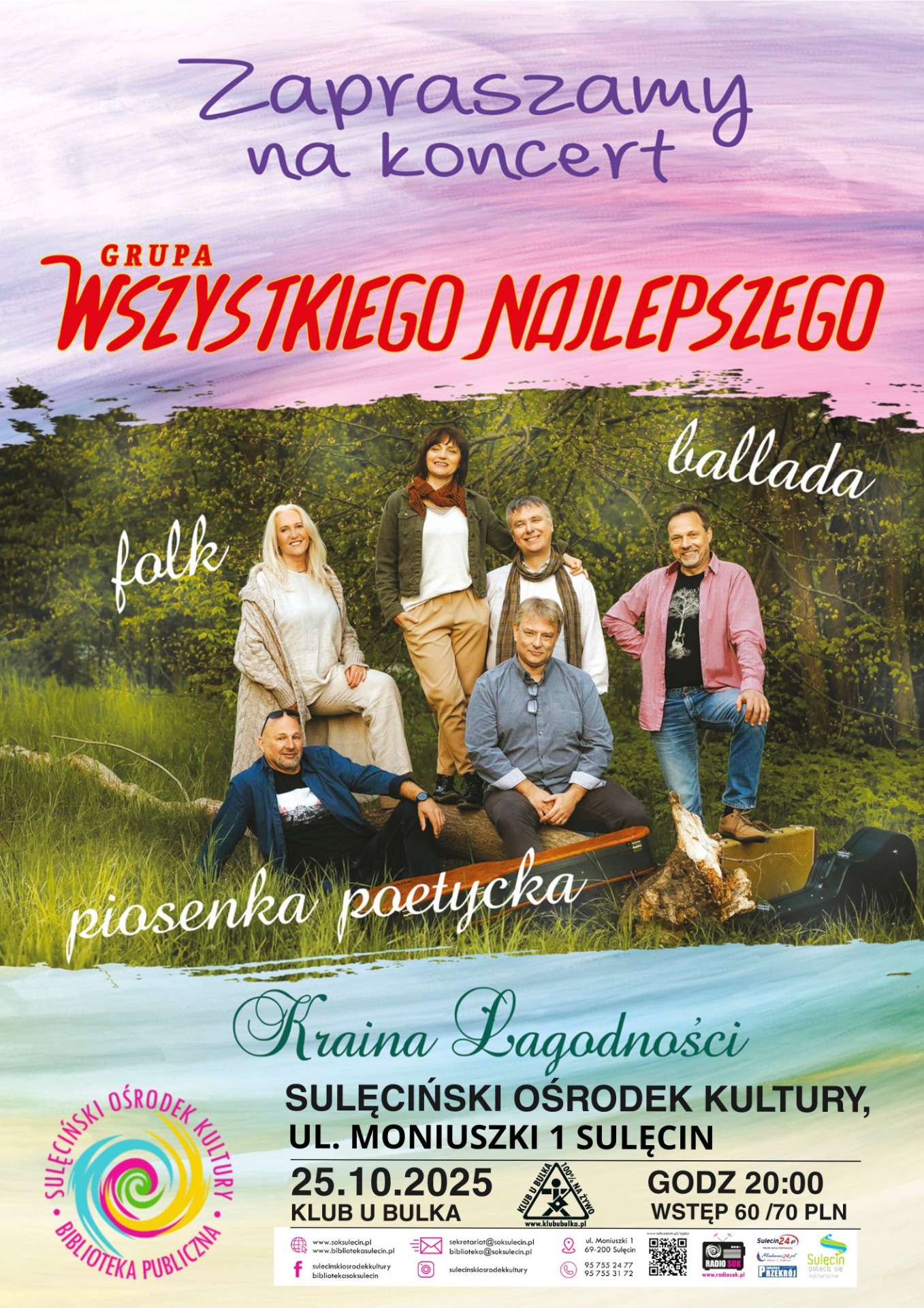 Czasem warto zwolnić, zatrzymać się na chwilę i posłuchać muzyki, która trafia prosto w serce. Takie spotkanie z poezją, humorem i ciepłem emocji odbędzie się w Sulęcinie. Już 25 października o godz. 20:00 w Klubie u Bulka wystąpi zespół Wszystkiego Najlepszego – legenda Krainy Łagodności.