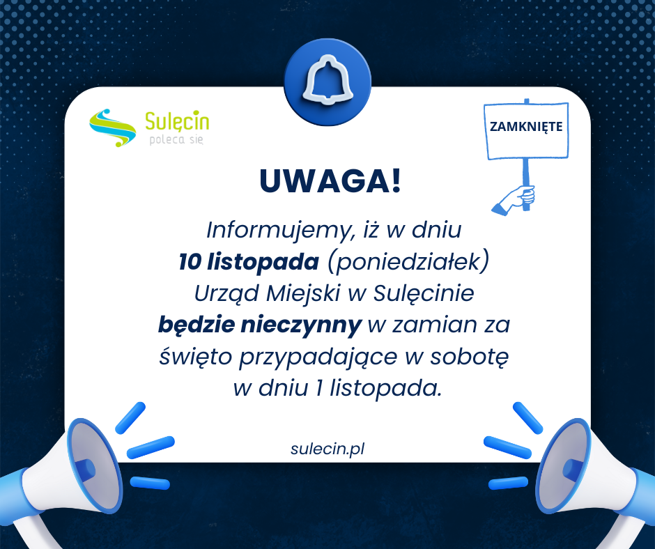Informujemy, iż w dniu 10 listopada (poniedziałek) Urząd Miejski w Sulęcinie będzie nieczynny w zamian za święto przypadające w sobotę w dniu 1 listopada.