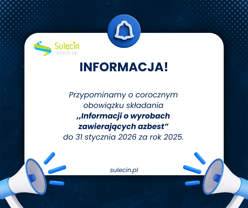 Wszystkim właścicielom, użytkownikom wieczystym lub zarządcom nieruchomości zlokalizowanych na terenie gminy Sulęcin, na których wykorzystywane są wyroby zawierające azbest, lub z których w roku poprzedzającym złożenie informacji usunięte zostały takie wyroby, przypominamy o obowiązku złożenia informacji o wyrobach zawierających azbest, w terminie do 31 stycznia 2026 za rok 2025.