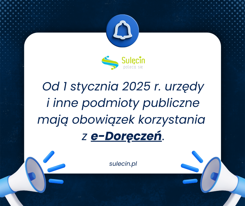 Informujemy, że od 1 stycznia 2025 r. Urząd – zgodnie z obowiązującymi przepisami – korzysta z systemu e-Doręczeń do doręczania korespondencji urzędowej.